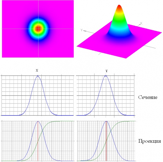 На верхнем рисунке приведены результаты измерений распределения интенсивности излучения с индикатрисой, близкой к Гауссовой. Видно, что сечения и проекции по обеим осям практически совпадают (это характерно для Гауссовых распределений).